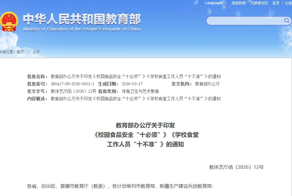 为巩固深化“校园餐”专项整治成果成效,持续加强校园食品安全管理,强化学校食堂一线工作人员安全意识,规范从业人员操作流程,教育部办公厅近日印发了《校园食品安全“十必须”》《学校食堂工作人员“十不准”》,进一步筑牢校园食品安全防线,为孩子们的健康成长保驾护航。