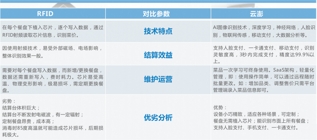市面上常见的是RFID设备,云澎智能结算餐台,比之如何呢?
